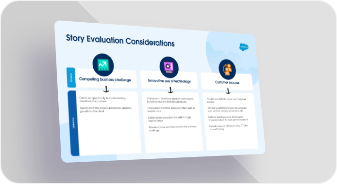 Story Evaluation Considerations Compelling business challenge Innovative use of technology Customer success Criteria Create an opportunity to fundamentally Utilization of Salesforce product technologies Provide quantiûable metrics and details of transform the business including new and emerging products success Specify how the project accelerates business Incorporate worküow and automation tools to Achieve quantiûable KPIs to the customer growth for the client enable scale such as time, money, conversions, etc. Demonstrate ecosystem breadth through Indicate leading success metrics post AppExchange implementation if details are not available Definition Provide unique solutions to solve the business Include measure of time to value (TTV) to challenge show efficiency