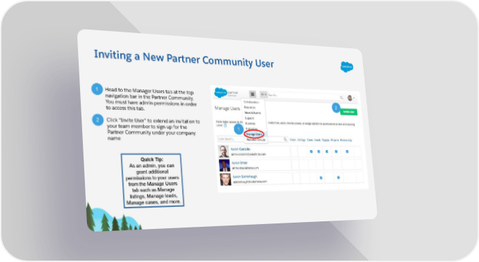 Inviting a New Partner Community User 1.1 Head to the Manager Users tab at the top navigation bar in the Partner Community. 2 You must have admin permissions in order to access this tab. 2. Click “Invite User” to extend an invitation to 2 your team member to sign up for the 1 Partner Community under your company name Quick Tip: As an admin, you can grant additional permissions to your users from the Manage Users tab such as Manage listings, Manage leads, Manage cases, and more.
