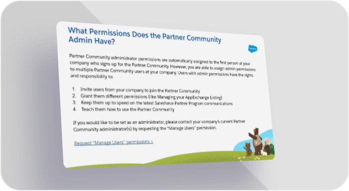 What Permissions Does the Partner Community Admin Have? Partner Community administrator permissions are automatically assigned to the first person at your company who signs up for the Partner Community. However, you are able to assign admin permissions to multiple Partner Community users at your company. Users with admin permissions have the rights and responsibility to: 1. Invite users from your company to join the Partner Community 2. Grant them different permissions (like Managing your AppExchange Listing) 3. Keep them up to speed on the latest Salesforce Partner Program communications 4. Teach them how to use the Partner Community If you would like to be set as an administrator, please contact your company’s current Partner Community administrator(s) by requesting the “Manage Users” permission. Request “Manage Users” permissions >