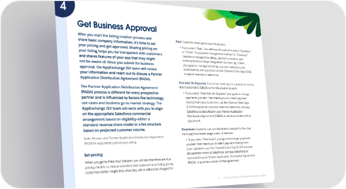 4 Get Business Approval After you start the listing creation process and Paid: Customer must pay to use this solution. share basic company information, it’s time to set • If you select “Paid,” you will have the option to select “Checkout” your pricing and get approved. Sharing pricing on or “Other” for payment management method. In “Checkout”, your listing helps you be transparent with customers Salesforce manages the billing, payment collection, and and shares features of your app that they might subscriptions (via Stripe integration). By choosing “Other”, not be aware of. Once you submit for business you agree to manage the billing, payment collection, and subscriptions, and you must use the Channel Order App (COA) approval, the AppExchange ISV team will review your information and reach out to discuss a Partner to report revenue to Salesforce. Application Distribution Agreement (PADA). Paid Add-On Required: Customers must pay for a product or service The Partner Application Distribution Agreement that is external to Salesforce for this solution to work. • If you select “Paid Add-On Required” you agree to manage (PADA) process is di昀昀erent for every prospective payments yourself. That means you will collect payment partner and is in昀氀uenced by factors like technology use cases and business go-to market strategy. The directly from your customers, use the Channel Order App (COA) to report all customer orders to Salesforce, and pay AppExchange ISV team will work with you to align Salesforce as described in your Partner Application on the appropriate Salesforce commercial arrangement based on eligibility—either a Distribution Agreement (PADA), or previous version of that standard revenue share model or a fee structure agreement. based on projected customer volume. Freemium: Customer can use this limited solution for free, but Note: An executed Partner Application Distribution Agreement must pay to increase usage, users, or features. (PADA) is required to publish your listing. • If you select “Freemium” you agree to manage payments yourself. That means you’ll collect payment directly from Set pricing your customers, use the Channel Order App (COA) to report all customer orders to Salesforce, and pay Salesforce as described in your Partner Application Distribution Agreement When you get to Price Your Solution, you will see that there are four (PADA), or previous version of that agreement. pricing models to choose from that best represent your listing, giving customers better insight into what they will or will not be charged for: 10 APPEXCHANGE ISV PARTNER ONBOARDING GUIDE