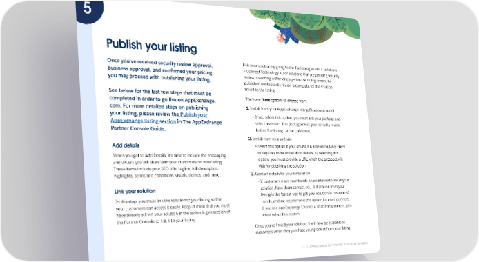 5 Publish your listing Once you’ve received security review approval, Link your solution by going to the Technologies tab > Solutions > Connect Technology +. For solutions that are pending security business approval, and con昀椀rmed your pricing, you may proceed with publishing your listing. review, a warning will be displayed as the listing cannot be published until security review is complete for the solution linked to the listing. See below for the last few steps that must be There are three options to choose from: completed in order to go live on AppExchange. com. For more detailed steps on publishing 1. Install from your AppExchange listing (Recommended) your listing, please review the Publish your • If you select this option, you must link your package and AppExchange listing section in The AppExchange select a version. This package must pass security review Partner Console Guide. before the listing can be published. 2. Install from your website Add details • Select this option if your solution is a downloadable client or requires more installation details. By selecting this When you get to Add Details, it’s time to include the messaging option, you must provide a URL which the prospect will and visuals you will share with your customers on your listing. visit for obtaining the solution. These items include your SEO title, tagline, full description, 3. Contact details for your installation highlights, terms and conditions, visuals, demos, and more. • If customers need your hands-on assistance to install your Link your solution solution, have them contact you. Installation from your listing is the fastest way to get your solution in customers’ In this step, you must link the solution to your listing so that hands, and we recommend this option for most partners. your customers can access it easily. Keep in mind that you must If you use AppExchange Checkout to collect payment, you have already added your solution in the technologies section of must select this option. the Partner Console to link it to your listing. Once you’ve linked your solution, it will now be available to customers when they purchase your product from your listing. 13 APPEXCHANGE ISV PARTNER ONBOARDING GUIDE