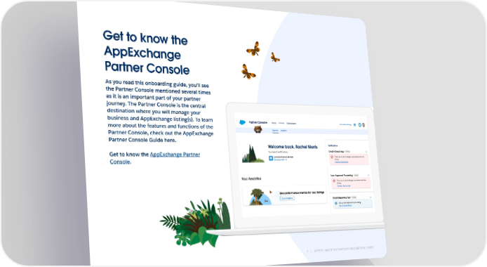 Get to know the AppExchange Partner Console As you read this onboarding guide, you’ll see the Partner Console mentioned several times as it is an important part of your partner journey. The Partner Console is the central destination where you will manage your business and AppExchange listing(s). To learn more about the features and functions of the Partner Console, check out the AppExchange Partner Console Guide here. Get to know the AppExchange Partner Console. 3 APPEXCHANGE ISV PARTNER ONBOARDING GUIDE 3 APPEXCHANGE ISV PARTNER ONBOARDING GUIDE