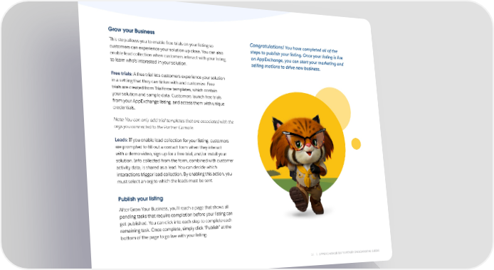 Grow your Business Congratulations! You have completed all of the This step allows you to enable free trials on your listing so steps to publish your listing. Once your listing is live customers can experience your solution up close. You can also on AppExchange, you can start your marketing and enable lead collection when customers interact with your listing selling motions to drive new business. to learn who’s interested in your solution. Free trials: A free trial lets customers experience your solution in a setting that they can tinker with and customize. Free trials are created from Trialforce templates, which contain your solution and sample data. Customers launch free trials from your AppExchange listing, and access them with unique credentials. Note: You can only add trial templates that are associated with the orgs you connected to the Partner Console. Leads: If you enable lead collection for your listing, customers are prompted to 昀椀ll out a contact form when they interact with a demo video, sign up for a free trial, and/or install your solution. Info collected from the form, combined with customer activity data, is shared as a lead. You can decide which interactions trigger lead collection. By enabling this action, you must select an org to which the leads must be sent. Publish your listing After Grow Your Business, you’ll reach a page that shows all pending tasks that require completion before your listing can get published. You can click into each step to complete each remaining task. Once complete, simply click “Publish” at the bottom of the page to go live with your listing. 14 APPEXCHANGE ISV PARTNER ONBOARDING GUIDE