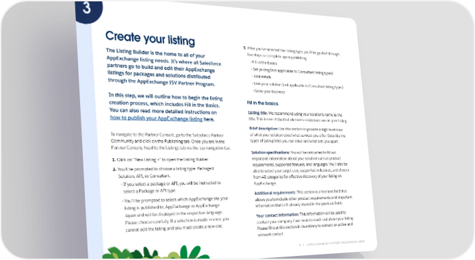3 Create your listing 3. After you’ve selected the listing type, you’ll be guided through The Listing Builder is the home to all of your 昀椀ve steps to complete upon publishing: • Fill in the basics AppExchange listing needs. It’s where all Salesforce partners go to build and edit their AppExchange • Set pricing (not applicable to Consultant listing types) listings for packages and solutions distributed • Add details • Link your solution (not applicable to Consultant listing types) through the AppExchange ISV Partner Program. • Grow your business In this step, we will outline how to begin the listing Fill in the basics creation process, which includes Fill in the Basics. You can also read more detailed instructions on Listing title: We recommend using your solution’s name as the how to publish your AppExchange listing here. title. This is one of the 昀椀rst elements customers see on your listing. Brief description: Use this section to provide a high-level view of what your solution does/what services you o昀昀er. Describe the To navigate to the Partner Console, go to the Salesforce Partner types of pain points you can solve and what sets you apart. Community and click on the Publishing tab. Once you are in the Partner Console, head to the Listings tab via the top navigation bar. Solution speci昀椀cations: You will be instructed to 昀椀ll out 1. Click on “New Listing +” to open the Listing Builder important information about your solution such as product 2. You’ll be prompted to choose a listing type: Packaged requirements, supported features, and languages. You’ll also be able to select your target user, supported industries, and choose Solution, API, or Consultant. from 48 categories for e昀昀ective discovery of your listing on • If you select a package or API, you will be instructed to AppExchange. select a Package or API type. Additional requirements: This section is a free text 昀椀eld that • You’ll be prompted to select which AppExchange site your allows you to include other product requirements and important listing is published to, AppExchange or AppExchange information that isn’t already shared in the previous 昀椀elds. Japan and will be displayed in the respective language. Your contact information: This information will be used to Please choose carefully. If a selection is made in error, you contact your company if we need to reach out about your listing. cannot edit the listing and you must create a new one. Please 昀椀ll out this section in its entirety to contact an active and relevant contact. 9 APPEXCHANGE ISV PARTNER ONBOARDING GUIDE