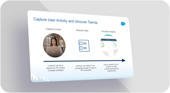 Capture User Activity and Uncover Trends Capture Events Request Data Visualize Insights Customer activity is Use an analytics tool to Retrieve user data for your captured for ISV partner visualize the data, managed package through an managed packages uncovering trends and API connection opportunities