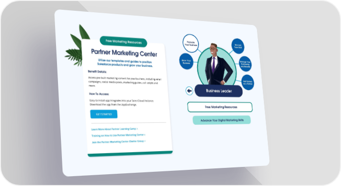 Hire and Hire and Promote Train Staff Train Staff Free Marketing Resources Your Business Partner Marketing Center Grow Your Manage Your Utilize our templates and guides to position Business Partnership and Benefits Salesforce products and grow your business. Benefit Details: Access pre-built marketing content for your business, including email Get Started campaigns, social media posts, marketing guides, call scripts and as a Partner more. Business Leader How To Access: Easy to install app integrates into your Sales Cloud instance. Download the app from the AppExchange. Free Marketing Resources GET STARTED Advance Your Digital Marketing Skills Learn More About Partner Learning Camp > Training on How to Use Partner Marketing Center > Join the Partner Marketing Center Chatter Group >