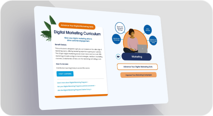Boost Your Drive Advance Your Digital Marketing Skills Marketing Demand Strategy Digital Marketing Curriculum Build Brand Optimize Your Grow your digital marketing skills to Awareness AppExchange drive customer engagement. Listing Benefit Details: This curriculum is designed to get you up to speed on the latest digital marketing topics, offering marketing expertise to grow your business. This 10-part digital marketing course covers topics such as: basic B2B Marketing marketing principles and go-to market strategies, mediaand marketing channels, fundamentals of data and the marketing technology stack. How To Access: Visit Partner Learning Camp to access the course. Advance Your Digital Marketing Skills START LEARNING Improve Your Marketing Campaigns Learn more about Digital Marketing Program > Get your Digital Marketing Program questions answered > Join the Digital Marketing Program Chatter Group >