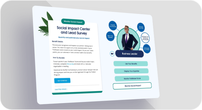 Monitor Social Impact Promote Hire and Your Business Train Staff Social Impact Center and Lead Survey Grow Your Manage Your Business Partnership Quantify and publicize your social impact. and Benefits Benefit Details: This resource recognizes and inspires our partners’ strong social Get Started values. You have the opportunity to be awarded points in your as a Partner Trailblazer scores based on your social impact. As you earn more points, you can advance in levels and earn additional benefits. Business Leader How To Access: To earn points in your Trailblazer Scorecard for your social impact initiatives, complete this survey and share with us how your Use Your Benefits organization is leading. Head over to the Partner Community to learn about how partners are driving impact and how you can be regonized through the Partner Display Your Expertise Program. GET STARTED Monitor Trailblazer Score Lead Pillar eBook > Monitor Social Impact
