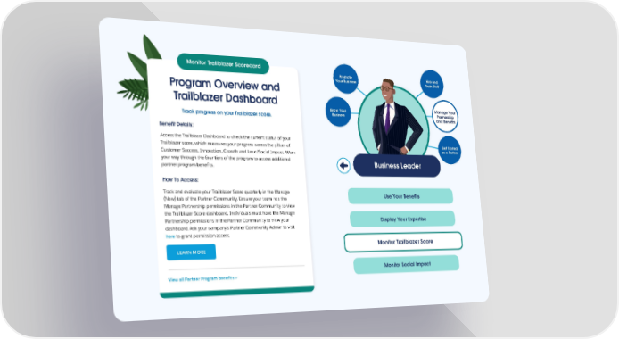 Monitor Trailblazer Scorecard Promote Hire and Your Business Train Staff Program Overview and Trailblazer Dashboard Manage Your Grow Your Partnership Track progress on your Trailblazer score. Business and Benefits Benefit Details: Access the Trailblazer Dashboard to check the current status of your Trailblazer score, which measures your progress across the pillars of Get Started Customer Success, Innovation, Growth and Lead/Social Impact. Work as a Partner your way through the four tiers of the program to access additional Business Leader partner program benefits. How To Access: Track and evaluate your Trailblazer Score quarterly in the Manage Use Your Benefits (New) tab of the Partner Community. Ensure your team has the Manage Partnership permissions in the Partner Community to view the Trailblazer Score dashboard. Individuals must have the Manage Partnership permissions in the Partner Community to view your Display Your Expertise dashboard. Ask your company’s Partner Community Admin to visit here to grant permission access. Monitor Trailblazer Score LEARN MORE Monitor Social Impact View all Partner Program benefits >