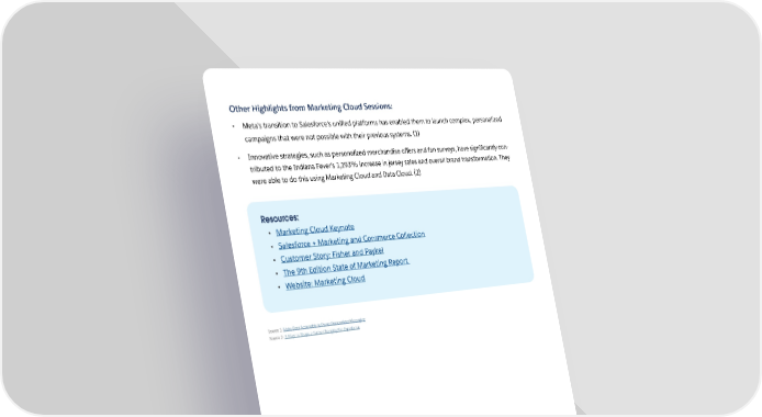 Other Highlights from Marketing Cloud Sessions: • Meta's transition to Salesforce's uni昀椀ed platforms has enabled them to launch complex, personalized campaigns that were not possible with their previous systems. (1) • Innovative strategies, such as personalized merchandise o昀昀ers and fan surveys, have signi昀椀cantly con- tributed to the Indiana Fever’s 1,193% increase in jersey sales and overall brand transformation. They were able to do this using Marketing Cloud and Data Cloud. (2) Resources: • Marketing Cloud Keynote • Salesforce + Marketing and Commerce Collection • Customer Story: Fisher and Paykel • The 9th Edition State of Marketing Report • Website: Marketing Cloud Source 1: Make Data Actionable to Power Personalized Messaging Source 2: 3 Ways to Shape a Game-Changing Fan Experience 20