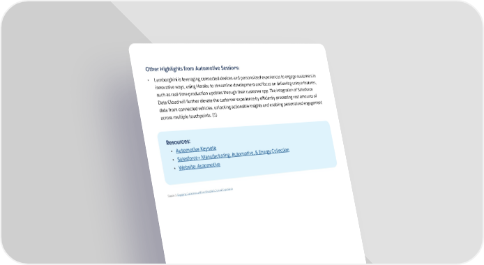 Other Highlights from Automotive Sessions: • Lamborghini is leveraging connected devices and personalized experiences to engage customers in innovative ways, using Heroku to streamline development and focus on delivering unique features, such as real-time production updates through their customer app. The integration of Salesforce Data Cloud will further elevate the customer experience by e昀케ciently processing vast amounts of data from connected vehicles, unlocking actionable insights and enabling personalized engagement across multiple touchpoints. (1) Resources: • Automotive Keynote • Salesforce+ Manufacturing, Automotive, & Energy Collection • Website: Automotive Source 1: Engaging Customers with Lamborghini’s “Unica” Experience 33