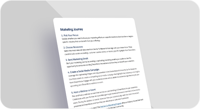 Marketing Journey 1. Pick Your Focus: Decide whether you want to focus your marketing e昀昀orts on a speci昀椀c Salesforce cloud solution or target a speci昀椀c industry that can bene昀椀t from your o昀昀erings. 2. Choose Resources: Select the most relevant resources from the Go-To-Market Kit that align with your chosen focus. These could include session recordings, customer success stories, or industry-speci昀椀c highlights from Dreamforce. 3. Send Marketing Email: Start your marketing journey by sending a captivating marketing email to your audience. Use this opportunity to announce exciting Dreamforce innovations and how they can bene昀椀t your customers. 4. Create a Social Media Campaign: Leverage the captivating images and copy provided in the Social Media Kit from the Go-To-Market Kit. Use these assets to create a compelling social media campaign that highlights key takeaways and insights from Dreamforce. Engage with your audience across various platforms and encourage them to join your upcoming post-Dreamforce webinar or event. 5. Host a Webinar or Event: Plan and host a webinar or event that serves as a post-brie昀椀ng of Dreamforce for your customers. Collaborate with your Partner Account Manager to get started and ensure a seamless and successful event. During the webinar or event, showcase how your solutions align with the latest innovations presented at Dreamforce and how they can elevate your customers' businesses. • Don’t know where to start? The Partner Co-Marketing Program o昀昀ers an Industry-focused demand generating webinar service. Learn more in the Partner Community. 50