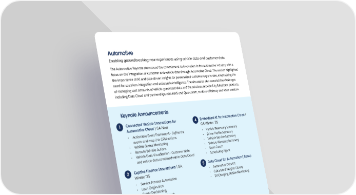 Automotive Enabling groundbreaking new experiences using vehicle data and customer data. The Automotive Keynote showcased the commitment to innovation in the automotive industry, with a focus on the integration of customer and vehicle data through Automotive Cloud. The session highlighted the importance of AI and data-driven insights for personalized customer experiences, emphasizing the need for seamless integration and actionable intelligence. The discussion also revealed the challenges of managing vast amounts of vehicle-generated data and the solutions provided by Salesforce products, including Data Cloud and partnerships with AWS and Qualcomm, to drive e昀케ciency and value creation. Keynote Announcements 1 Connected Vehicle Innovations for 4 Embedded AI for Automotive Cloud | Automotive Cloud | GA Now GA Winter ’25 • Actionable Event Framework - De昀椀ne the • Vehicle Telemetry Summary events and map it to CRM actions • Driver Pro昀椀le Summary • Vehible Status Monitoring • Vehicle Service Summary • Remote Vehible Actions • Vehicle Warranty Summary • Vehicle Data Visualization - Customer data • Sales Coach and vehicle data combined within Data Cloud • Scheduling Agent 2 Captive Finance Innovations | GA 5 Data Cloud for Automation | Recap Winter ’25 • Automative Data Kit • Service Process Automation • Calculated Insights Library • Loan Origination • EV Charging Station Monitoring • Credit Decisioning • Underwriter Workbench • Collections (Pilot) 3 Automotive Cloud Enhancements | Recap • Service Automation • Product Catalog Management • Trade-In and Appraisals • Parts & Vehicle Inventory Search 32