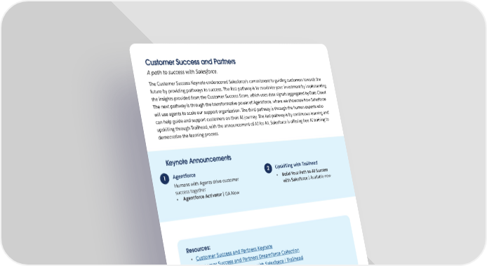 Customer Success and Partners A path to success with Salesforce. The Customer Success Keynote underscored Salesforce's commitment to guiding customers towards the future by providing pathways to success. The 昀椀rst pathway is to maximize your investment by implementing the insights provided from the Customer Success Score, which uses data signals aggregated by Data Cloud. The next pathway is through the transformative power of Agentforce, where we showcase how Salesforce will use agents to scale our support organization. The third pathway is through the human experts who can help guide and support customers on their AI journey. The last pathway is by continuous learning and upskilling through Trailhead, with the announcement of AI for All, Salesforce is o昀昀ering free AI training to democratize the learning process. Keynote Announcements 1 Agentforce 2 Upskilling with Trailhead Humans with Agents drive customer • Build Your Path to AI Success success together with Salesforce | Available now • Agentforce Activator | GA Now Resources: • Customer Success and Partners Keynote • Customer Success and Partners Dreamforce Collection • Build Your Path to AI Success with Salesforce | Trailhead • Website: Customer Success 45