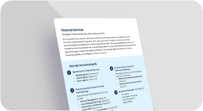 Financial Services Transform Financial Services with Humans and AI. The Financial Services Keynote centered around the transformative potential of Agentforce within the sector, emphasizing the integration of AI, data, and action to rede昀椀ne customer experiences. Demonstrating the commitment to industry-speci昀椀c innovation, the session highlighted the launch of Financial Services Cloud and its role in accelerating customer success. The presentation showcased how Agentforce agents, built on the Salesforce Platform, will automate tasks and enable 24/7 service, providing scalability and intelligence to 昀椀nancial services. Keynote Announcements 1 Agentforce for Financial Services 4 Financial Services Cloud for • Banking Agents | Summer ‘25 Commercial Banking • Advisor Agents | Winter ‘25 Precon昀椀gured Solutions for Client Engage- • Claims Agents | Winter ‘25 ment and Onboarding • Business and Relationship Building | Winter ‘24 2 Financial Services Cloud for Invest- • Business Services Product Model | ment Banking Spring ‘25 Modernize Agency Management on the #1 5 Insurance Brokerage | GA Spring '25 AI CRM • Account Management | Spring ‘25 • Foundation • Line of Business Servicing | Spring ‘25 • Commission Processing • Commissions and Revenue | Spring ‘25 • Client Management • Carrier RFPS | Summer ‘25 • Agency Billing • Agentforce for Insurance Brokers | Summer ‘25 • Commissions and Revenue | Summer ‘25 3 Compliance | GA Spring '25 • Preventative Controls • Control Management • AI Powered Regulation Management • Compliance Analytics 38