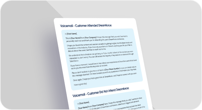 Voicemail - Customer Attended Dreamforce: Hi [First Name], This is [Your Name] from [Your Company]. I hope this message 昀椀nds you well. I wanted to personally reach out and thank you for attending this year's Dreamforce conference. I hope you found the content and sessions valuable in gaining insights into the latest trends and innovations in the industry. If you have any questions or if there's anything speci昀椀c you'd like to discuss about the event, feel free to reach out to me. We understand that schedules can get busy, so if you couldn't attend all the sessions you were interested in, don't worry! You can still access the majority of key sessions on-demand through Salesforce+. If you have a moment, I would love to hear about your experience at Dreamforce and what stood out to you the most from the keynotes or sessions. Please don't hesitate to give me a call back at [Your Phone Number], or you can simply reply to this message via email. I'm here to assist you with any questions or information you may need. Once again, I hope you had a great time at Dreamforce, and I hope to connect with you soon. Have a great day! Voicemail - Customer Did Not Attend Dreamforce: Hi [First Name], [Your Name] from [Your Company] here. I hope this message 昀椀nds you well. I wanted to share some updates from this year's Dreamforce conference, Salesforce’s biggest annual event. The conference was packed with innovative sessions and keynotes that explored the latest industry trends. Even though you couldn't attend in person, you can still catch up on most of the key sessions through Salesforce+ on-demand. If you're interested in the event's highlights and key takeaways, you can access them at your convenience. Feel free to call me at [Your Phone Number] or reply to this email if you have any questions or need more information about the on-demand sessions Thank you for your time, and I hope you 昀椀nd the Dreamforce resources valuable for your business. Have a great day! Best regards, [Your Name] 58