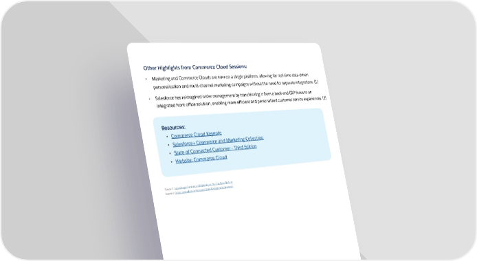 Other Highlights from Commerce Cloud Sessions: • Marketing and Commerce Clouds are now on a single platform, allowing for real-time data-driven personalization and multi-channel marketing campaigns without the need for separate integrations. (1) • Salesforce has reimagined order management by transitioning it from a back-end ERP focus to an integrated front o昀케ce solution, enabling more e昀케cient and personalized customer service experiences. (2) Resources: • Commerce Cloud Keynote • Salesforce+ Commerce and Marketing Collection • State of Connected Customer - Third Edition • Website: Commerce Cloud Source 1: Supercharge Commerce & Marketing on the Salesforce Platform Source 2: Get an Inside Look at the Latest Order Management Innovation 22