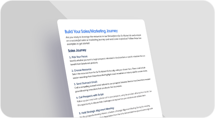 Build Your Sales/Marketing Journey Are you ready to leverage the resources in our Dreamforce Go-To-Market Kit and embark on a successful sales or marketing journey and need some inspiration? Follow these two examples to get started: Sales Journey 1. Pick Your Focus: Identify whether you want to target prospects interested in cloud solutions or speci昀椀c industries that can bene昀椀t from Salesforce’s products. 2. Choose Resource: Select the resources from the Go-To-Market Kit that align with your chosen focus. These could include session recordings from Dreamforce that highlight cloud innovations or industry-speci昀椀c success stories. 3. Send Outreach Email: Craft a compelling outreach email tailored to your prospects' interests. Mention how Dreamforce revealed groundbreaking innovations that can elevate their businesses. 4. Call Prospects with Script: Follow up your email with a phone call to your prospects, using the provided call script from the kit. Use this opportunity to discuss their challenges and explore how your solutions can address them. 5. Hold Strategic Alignment Meeting: For the prospects showing interest, schedule a Strategic Alignment Meeting. During this meeting, leverage the Innovation Pack Presentation from the kit to demonstrate how your solutions align with their vision and objectives. 49