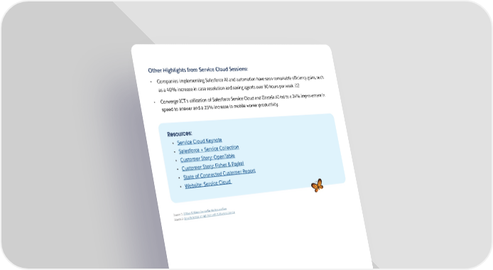 Other Highlights from Service Cloud Sessions: • Companies implementing Salesforce AI and automation have seen remarkable e昀케ciency gains, such as a 40% increase in case resolution and saving agents over 90 hours per week. (1) • Converge ICT's utilization of Salesforce Service Cloud and Einstein AI led to a 24% improvement in speed to answer and a 25% increase in mobile worker productivity. Resources: • Service Cloud Keynote • Salesforce + Service Collection • Customer Story: OpenTable • Customer Story: Fisher & Paykel • State of Connected Customer Report • Website: Service Cloud Source 1: 3 Ways AI Makes Service Frictionless and Fun Source 2: Drive Retention in High Tech with AI-Powered Service 18