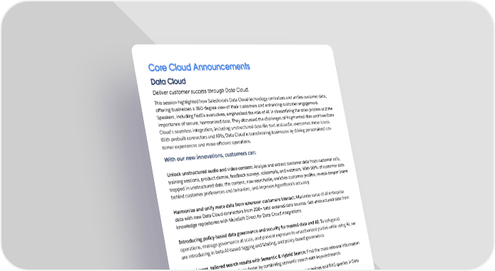 Core Cloud Announcements Data Cloud Deliver customer success through Data Cloud. This session highlighted how Salesforce’s Data Cloud technology centralizes and uni昀椀es customer data, o昀昀ering businesses a 360-degree view of their customers and enhancing customer engagement. Speakers, including FedEx executives, emphasized the role of AI in streamlining the sales process and the importance of secure, harmonized data. They discussed the challenges of fragmented data and how Data Cloud's seamless integration, including unstructured data like text and audio, overcomes these issues. With prebuilt connectors and APIs, Data Cloud is transforming businesses by driving personalized cus- tomer experiences and more e昀케cient operations. With our new innovations, customers can: Unlock unstructured audio and video content: Analyze and extract customer data from customer calls, training sessions, product demos, feedback surveys, voicemails, and webinars. With 90% of customer data trapped in unstructured data, the content, now searchable, enriches customer pro昀椀les, reveals deeper intent behind customer preferences and behaviors, and improves Agentforce’s accuracy. Harmonize and unify more data from wherever customers interact: Maximize value of all enterprise data with new Data Cloud connectors from 200+ total external data sources. Get unstructured data from knowledge repositories with MuleSoft Direct for Data Cloud integrations. Introducing policy-based data governance and security for trusted data and AI: To safeguard operations, manage governance at scale, and prevent exposure to unauthorized parties while using AI, we are introducing in beta AI-based tagging and labeling, and policy-based governance. Get relevant, tailored search results with Semantic & Hybrid Search: Find the most relevant information in the company’s knowledge base faster by combining semantic search with keyword search. Ground AI with unstructured data using no code retrievers: Set up pipelines and RAG queries in Data Cloud, using point-and-click tools for grounding on enterprise unstructured data for AI. Improve customer experiences with sub-second real-time layer: Ingest, analyze, and act on real-time data to instantly respond to changing customer needs. Employ no-code creation of a single Data Cloud instance with Data Cloud One: Connect multiple Salesforce orgs with consistent metadata that may be siloed; extend all of Salesforce Platform and Data Cloud actions and functionality with consistent metadata across all Salesforce instances with clicks, not code. Deliver business-context aware analytics with Tableau Semantics: Create a standard semantic model, ensuring all users (including AI) interpret and use data consistently. Customer-managed keys: Used for Data Cloud encryption to allow organizations to manage their own encryption keys, ensuring data stays encrypted and secure regardless of how it’s used. 12