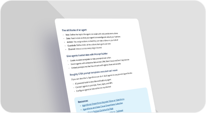 Five attributes of an agent • Role: De昀椀ne the topics the agent can assist with and provide instructions • Data: Feed in data so that your agent is knowledgeable about your business • Actions: You assign actions so that they can take actions on your behalf • Guardrails: De昀椀ne limits of the actions that agents can take • Channel: Interact across every single channel Give agents trusted data with Prompt Builder • Create reusable templates to take prompt-driven action • Enrich agents with enterprise data across CRM, Data Cloud, and Zero Copy sources • Embed prompts into the 昀氀ow of work with agents, 昀氀ows and records Roughly 170K prompt templates executed each week If you can describe it, Agentforce can do it. Build agents for any job with Agent Builder. • AI powered tools to describe and build any agent • Connect agents to prompts, 昀氀ows, Apex, and APIs • Con昀椀gure agents to take action on any channel Resources: • Agentforce Dreamforce Keynote Video on Salesforce+ • Agentforce and Data Cloud Dreamforce Collection • Agentforce Partner Community Page • Build Your First Agent with Agentforce - Trailhead • AI Specialist Certi昀椀cation • Agentforce Partner Readiness Webinar • Agentforce Partner Readiness Guide • Website: Agentforce 10