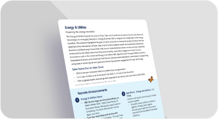 Energy & Utilities Powering the energy transition. The Energy & Utilities Keynote focused on Trust, Data and AI and how companies like Alia, Iberdrola and Neoenergia are leveraging Salesforce's Energy & Utilities 360 to navigate the complexities of the energy transition. The sessions highlighted the gap in trust & value that is slowing the energy transition and the potential at the intersection of Trust, Data and AI to drive business results and operational e昀케ciencies. Iberdrola and Neoenergia shared their 昀椀eld service implementation across various countries whilst Alia Ambientali Servizi talked about how they are promoting sustainable engagement across Tuscany. Innovations such as the connected Energy and Utilities 360, Agentforce for Energy & Utilities as well as Embedded AI Actions and Enhanced Field Service, demonstrated Salesforce's commitment to supporting companies in achieving net zero goals and enhancing customer engagement through technology. Sales Teams Run on Sales Cloud • 2025 is the year renewable electricity will eclipse coal generation. • 1 in 3 cars in China is set to be electric by 2030. 1 in 5 cars in the US and EU. • 75% of global electric demand growth expected to be met by solar and wind in 2024-2025. Source: IEA Global EV outlook 2024 | IEA Electricity Mid-Year Update | BNEF Long-term EV Outlook Keynote Announcements 1 Energy & Utilities Cloud 3 Agentforce - Energy and Utilities | GA • E&U Service Apps are Innovation-Ready on Today Core | Winter 2025 - Data-Cloud Ready, AI Humans with Agents drive Energy & Utilities success together Innovation-Ready, Managing Large Customer Complexity, No Install Required for Service • Examples: Sustainability and Advisor Apps, and more Agents or Energy Saver Agents • Turn Your Asset Data with Action with • Provide agents with the information Connected Assets | GA Today - Through Data and actions to help improve business Cloud, making it easy to connect energy and e昀케ciency utility speci昀椀c assets and bring that Data into Salesforce Asset-Centric Field Service | GA Today 2 Augment Productivity with E&U AI 4 Actions | Announcing Spring ’25 • Improved capabilities around asset 41% of time is lost to low value and repetitive management tasks (Source): Slack “New Research in AI Use at • Schedule & Dispatch with AI, Multi-Day Work & Multi-Zone Optimization, Work,” 2024. • Bill & Energy Usage - Bill Summary, Bill History Entitlements and Work Order Estima Insights, Rate and Usage Insights tion, O昀툀ine Mobile Work, Dynamic • Account & Customer Service - Account & Forms, Asset Service Predication, Interaction Overview, Customer Interaction Pre-Work Briefs & Work Summaries Summary, Account Service Case Summary, with AI, Asset Health Score, and Service Chat Summaries Timesheet Management & Labour Cost • Clean Energy Advisors - Clean Energy Program Optimization (Winter’25) Recommendations 34 • Field Work - Post-Work Summary