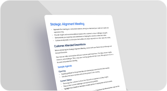 Strategic Alignment Meeting • Approach the meeting as a consultative session, aiming to understand your customer's needs and aspirations fully. • Provide insights and recommendations based on the customer's unique challenges and goals. • Demonstrate your expertise and commitment to helping the customer achieve their vision. • Collaboratively build an action plan that outlines the steps required to turn their vision into reality. Customer Attended Dreamforce Before scheduling the Strategic Alignment Meeting, connect with your Partner Account Manager and Account Executive. First, have an initial conversation with your customer post-Dreamforce. This helps uncover insights, interests, and challenges. Then, align your meeting agenda with their needs. This approach ensures a focused and productive meeting. Sample Agenda Opening: • Express gratitude for the partnership and reiterate your commitment to their success. • Introduce the team members who will be present in the meeting. Current Status: • Encourage the customer to share their Dreamforce experience and key insights. • Discuss their current challenges and top business priorities. • Highlight how Salesforce has been a trusted partner in helping them achieve success. Customer Vision: • Take a look at the customer's current state and how Dreamforce has in昀氀uenced their vision for the future. • Explore the customer's evolved Connected Vision post-Dreamforce. • Dive deeper into the new opportunities that have emerged as a result of their participation in the conference. Make it Real: • Engage in a collaborative discussion about the top value propositions o昀昀ered by your solutions. • Share relevant customer success stories and case studies that align with their vision. Action Plan: • Work together with the customer to create a roadmap that aligns their vision with actionable steps. • Identify key performance indicators (KPIs) to measure progress towards shared goals. • Set clear milestones and responsibilities for both teams. 60