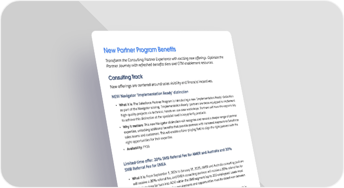 New Partner Program Bene昀椀ts Transform the Consulting Partner Experience with exciting new o昀昀erings. Optimize the Partner Journey with refreshed bene昀椀ts tiers and GTM enablement resources. Consulting Track New o昀昀erings are centered around sales visibility and 昀椀nancial incentives. NEW Navigator ‘Implementation Ready’ distinction • What it is: The Salesforce Partner Program is introducing a new 'Implementation Ready' distinction as part of the Navigator scoring. 'Implementation Ready' partners are those equipped to implement high-quality projects via technical, hands-on use case workshops. Partners will have the opportunity to achieve this distinction at the specialist level in key priority products • Why it matters: This new Navigator distinction will recognize and reward a deeper range of partner expertise, unlocking additional bene昀椀ts that provide partners with increased exposure to Salesforce sales teams and customers. This will enable a fairer playing 昀椀eld to align the right partners with the right opportunities for their expertise. • Availability: FY26 Limited-time o昀昀er: 20% SMB Referral Fee for AMER and Australia and 30% SMB Referral Fee for EMEA • What it is: From September 1, 2024 to January 31, 2025, AMER and Australia consulting partners will receive a 20% referral fee, and EMEA consulting partners will receive a 30% referral fee for leads that close (or turn into ACV) within the SMB segment (up to 200 employees). Leads must meet the standard referral policy requirements and opportunities must be closed-won between September 1, 2024 and January 31, 2025. • Why it matters: This limited-time o昀昀er is designed to invest in and accelerate partner growth in this critical segment. Partners bene昀椀t from generating higher revenue with the increased referral fees and are incentivized to capture new SMB clients for business growth. • Availability: September 2024