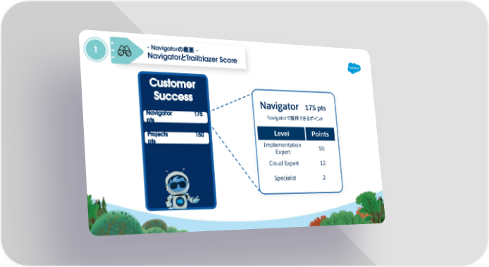 Navigatorで獲得できるポイント Navigator Level Points Implementation Expert 50 Cloud Expert 12 Specialist 2 175 pts - Navigatorの概要 - NavigatorとTrailblazer Score 1 7 Customer Success Navigator 175 pts Projects 150 pts