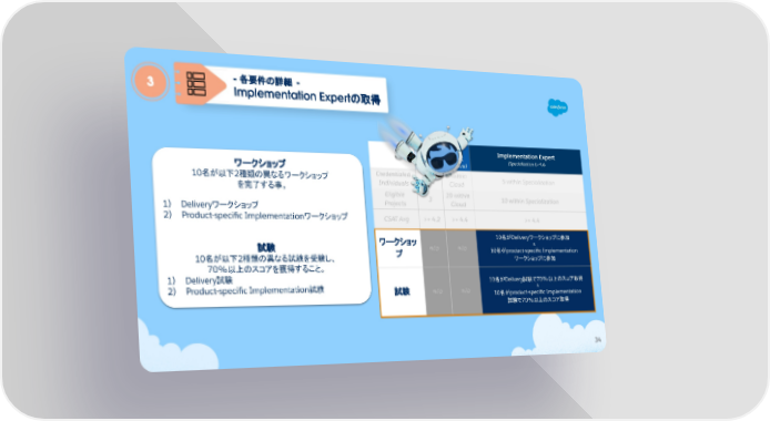 ワークショップ 10名が以下2種類の異なるワークショップ を完了する事。 1) Deliveryワークショップ 2) Product-specific Implementationワークショップ 試験 10名が以下2種類の異なる試験を受験し、 70%以上のスコアを獲得すること。 1) Delivery試験 2) Product-specific Implementation試験 Speciali st Cloud Expert (Cloud level) Implementation Expert (Specialization レベル Credentialed Individuals 1 5 within Cloud 5 within Specialization Eligible Projects 3 10 within Cloud 10 within Specialization CSAT Avg >= 4.2 >= 4.4 >= 4.4 ワークショッ プ n/a n/a 10名がDeliveryワークショップに参加 & 10名がproduct-specific Implementation ワークショップに参加 試験 n/a n/a 10名がDelivery試験で70%以上のスコア取得 & 10名がproduct-specific Implementation 試験で70%以上のスコア取得 取得要件 - 各要件の詳細 - Implementation Expertの取得 3 34