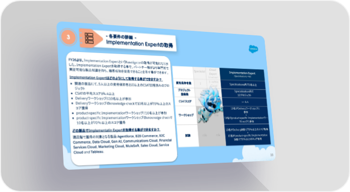 Specialist Cloud Expert (cloud level) Implementation Expert (Specializationレベル) 資格保持者数 1 5 within Cloud Specilizationa内で5名以上 プロジェクト 登録数 3 10 within Cloud Specialization内で 10プロジェクト CSATスコア >= 4.2 >= 4.4 >= 4.4 ワークショップ n/a n/a 10名がDeliveryワークショップに 参加 & 10名がproduct-specific Implementationワー クショップに参加 試験 n/a n/a 10名がDelivery試験で70%以上のスコア取得 & 10名がproduct-specific Implementation 試験で70%以上のスコア取得 FY26より、Implementation ExpertというNavoigatorの取得が可能になりま した。Implementation Expertを取得する事で、パートナー様がより専門的で 実証可能な製品知識を持ち、顧客成功を促進できることを示す事ができます。 Implementation Expertはどのようにして取得する事ができますか? ● 関連の製品にて、5人以上の資格保持者と10以上のCSAT回答済みのプロ ジェクト ● CSATの平均スコアが4.4以上 ● Deliveryワークショップに10名以上が参加 ● Deliveryワークショップのknowledge-checkで10名以上が70%以上のス コア獲得 ● product-specific Implementationワークショップに10名以上が参加 ● product-specific Implementationワークショップのknowledge-checkで 10名以上が70%以上のスコア獲得 どの製品でImplementatin Expertを取得する事ができますか? 現段階で獲得の対象となる製品: Agentforce, B2B Commerce, B2C Commerce, Data Cloud, Gen AI, Communications Cloud, Financial Services Cloud, Marketing Cloud, MuleSoft, Sales Cloud, Service Cloud and Tableau. 取得要件 - 各要件の詳細 - Implementation Expertの取得 3 33