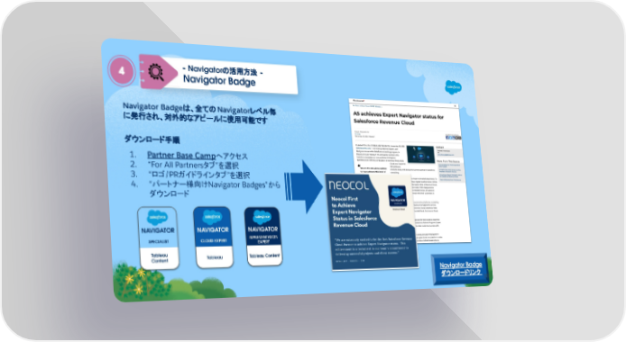 Navigator Badge ダウンロードリンク Navigator Badgeは、全ての Navigatorレベル毎 に発行され、対外的なアピールに使用可能です ダウンロード手順 1. Partner Base Campへアクセス 2. “For All Partnersタブ”を選択 3. “ロゴ/PRガイドラインタブ”を選択 4. “パートナー様向けNavigator Badges”から ダウンロード 4 - Navigatorの活用方法 - Navigator Badge 39