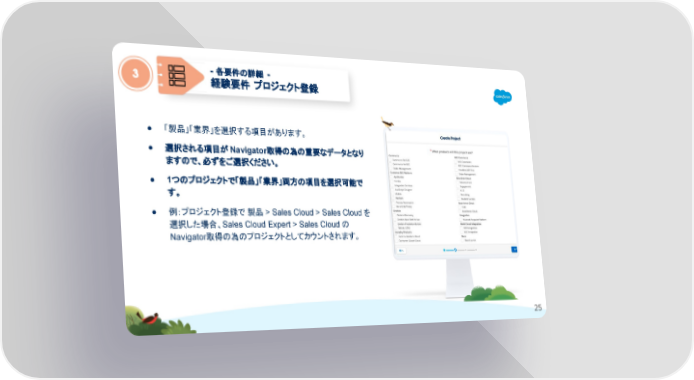 ● 「製品」「業界」を選択する項目があります。 ● 選択される項目が Navigator取得の為の重要なデータとなり ますので、必ずをご選択ください。 ● 1つのプロジェクトで「製品」「業界」両方の項目を選択可能で す。 ● 例:プロジェクト登録で 製品 > Sales Cloud > Sales Cloud を 選択した場合、Sales Cloud Expert > Sales Cloud の Navigator取得の為のプロジェクトとしてカウントされます。 - 各要件の詳細 - 経験要件 プロジェクト登録 3 25