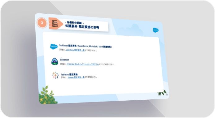 Tableau 認定資格 詳細は、Tableau認定資格一覧をご確認ください。 Trailhead認定資格 (Salesforce, MuleSoft, Slack関連資格 ) 詳細は、Salesforce認定資格一覧をご確認ください。 Superset 詳細は、FY26 コンサルティングパートナープログラム P.57をご確認ください。 19 - 各要件の詳細 - 知識要件 認定資格の取得 3