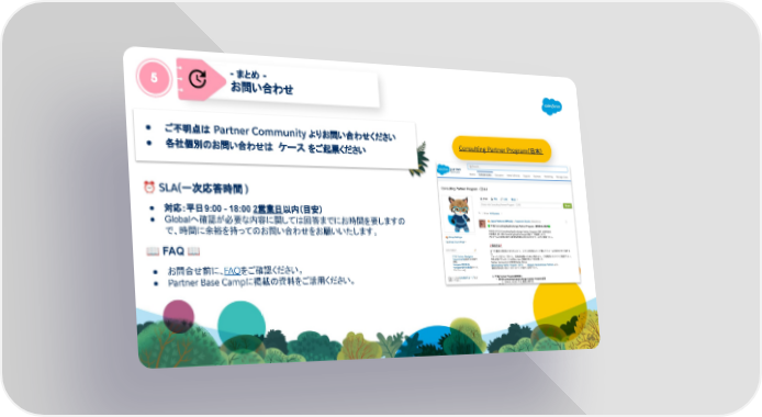 Consulting Partner Program(日本) ⏰ SLA(一次応答時間 ) ● 対応:平日9:00 - 18:00 2営業日以内(目安) ● Globalへ確認が必要な内容に関しては回答までにお時間を要しますの で、時間に余裕を持ってのお問い合わせをお願いいたします。 📖 FAQ 📖 ● お問合せ前に、FAQをご確認ください。 ● Partner Base Campに掲載の資料をご活用ください。 5 - まとめ - お問い合わせ ● ご不明点は Partner Community よりお問い合わせください ● 各社個別のお問い合わせは ケース をご起票ください 46