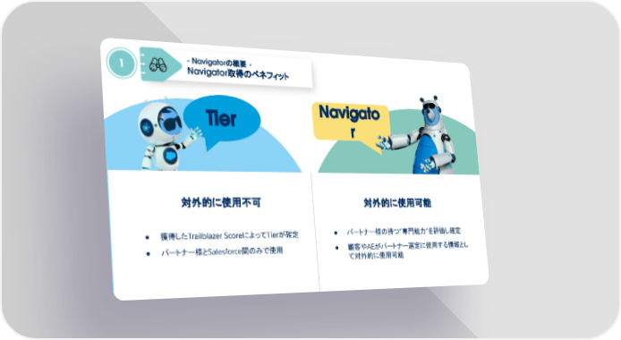 Navigato r Navigator Tier 8 対外的に使用不可 ● 獲得したTrailblazer ScoreによってTierが確定 ● パートナー様とSalesforce間のみで使用 対外的に使用可能 ● パートナー様の持つ”専門能力”を評価し確定 ● 顧客やAEがパートナー選定に使用する情報とし て対外的に使用可能 - Navigatorの概要 - Navigator取得のベネフィット 1