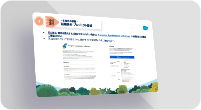 FY26 Navigator Program Japanese version Page 25 Page 27● どの製品・業界を選択すれば良いかわからない場合は Navigator Specialization Definitions で各選択肢の定義を ご確認ください。 ● 英語の資料となっておりますので、翻訳サイト等を使用のうえご確認ください。 - 各要件の詳細 - 経験要件 プロジェクト登録 3 26