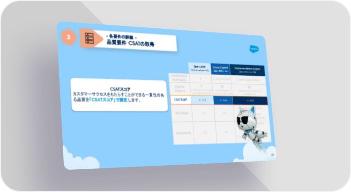 CSATスコア カスタマーサクセスをもたらすことができる一貫性のあ る品質を「CSATスコア」で測定 します。 Specialist (Specializationレベル) Cloud Expert (製品/業界レベル) Implementation Expert (Specializationレベル) Credentialed Individuals 1 5 within Cloud 5 within Specialization Eligible Projects 3 unique projects under each specialization 10 unique projects across entire cloud 10 unique projects under each specialization CSATスコア >= 4.2 >= 4.4 >= 4.4 Workshops n/a n/a 10 Delivery Workshops & 10 product-specific Implementation Workshops Assessments n/a n/a 10 Delivery Assessments w/ score > .7 & 10 product-specific Implementation Assessments w/ score > .7 - 各要件の詳細 - 品質要件 CSATの取得 3 29