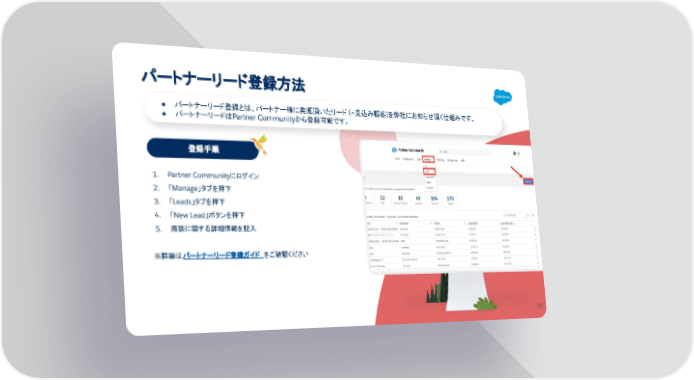 パートナーリード登録方法 登録手順 Japaneseと記載が無いワークショップは全て英語での開催となります ● パートナーリード登録とは、パートナー様に発掘頂いたリード (=見込み顧客)を弊社にお知らせ頂く仕組みです。 ● パートナーリードはPartner Communityから登録可能です。 1. Partner Communityにログイン 2. 「Manage」タブを押下 3. 「Leads」タブを押下 4. 「New Lead」ボタンを押下 5. 商談に関する詳細情報を記入 ※詳細はパートナーリード登録ガイド をご確認ください 35