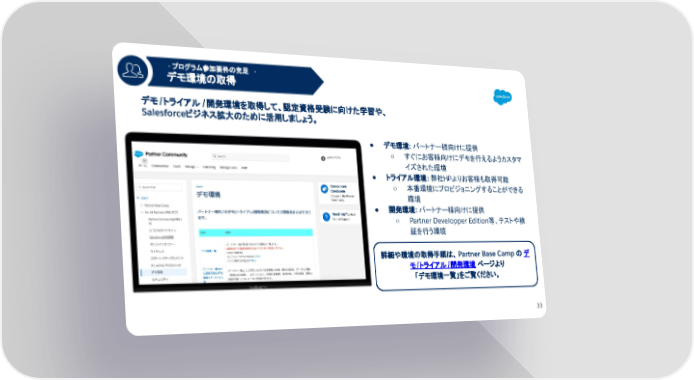 - プログラム参加要件の充足 - デモ環境の取得 1 デモ/トライアル /開発環境を取得して、認定資格受験に向けた学習や、 Salesforceビジネス拡大のために活用しましょう。 ● デモ環境: パートナー様向けに提供 ○ すぐにお客様向けにデモを行えるようカスタマ イズされた環境 ● トライアル環境: 弊社HPよりお客様も取得可能 ○ 本番環境にプロビジョニングすることができる 環境 ● 開発環境: パートナー様向けに提供 ○ Partner Developper Edition等、テストや検 証を行う環境 詳細や環境の取得手順は、 Partner Base Camp の デ モ/トライアル/開発環境 ページより 「デモ環境一覧」をご覧ください。 33