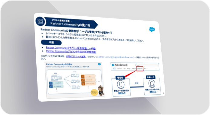 ● 1パートナーにつき、システム管理者は必ず2人以上作成ください。 ● 最初にログインした管理者は、Partner Communityの「ユーザの管理タブ」から新規ユーザを招待してください。 Partner Communityの管理者を「ユーザの管理」タブから招待する 新規ユーザ 招待 管理者 新規ユーザ招待方法 資料リンク 新規アカウント作成方法 資料リンク - ビジネス情報の把握 - Partner Communityの使い方 1 手順 8 ● Partner Communityアカウント作成(新規ユーザ編) ● Partner Communityアカウント作成方法(管理者編) ※ログインできない場合は、 代理の方にケース起票 いただくか、<[email protected]>へ英語のメールでお問い合わせくだ さい。