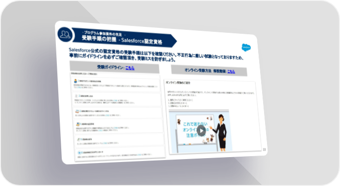 - プログラム参加要件の充足 - 受験手順の把握 - Salesforce認定資格 1 Salesforce公式の認定資格の受験手順は以下を確認ください。不正行為に厳しい試験となっておりますため、 事前にガイドラインを必ずご確認頂き、受験ミスを防ぎましょう。 受験ガイドライン: こちら オンライン受験方法 解説動画:こちら 22