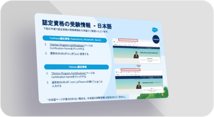 20 1. “Partner Program Certifications”ページの Certification Nameをクリックする 2. 遷移先のURLの「en」を「ja」に変更する 認定資格の受験情報 - 日本語 下記の手順で認定資格の受験情報を日本語でご確認いただけます。 Trailhead認定資格 (Salesforce, MuleSoft, Slack) Tableau認定資格 1. “Partner Program Certifications”ページの Certification Nameをクリックする 2. 遷移先のURLの「.com/」と「learn」の間に「ja-jp/」と 入力する 20 Example *日本語ページが表示されない場合は、日本語の試験情報は提供されていません。