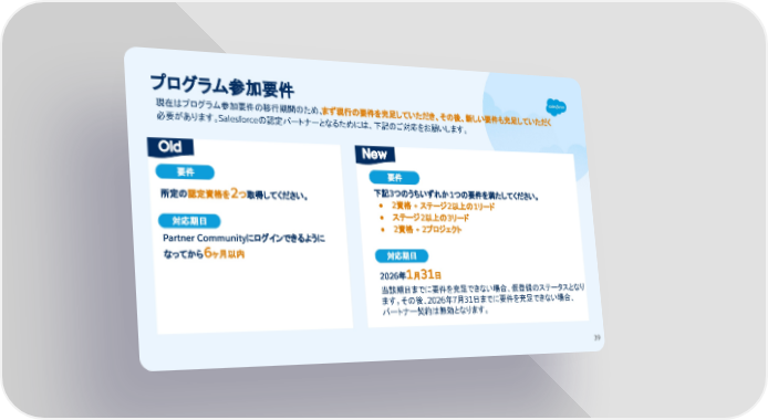 所定の認定資格を2つ取得してください。 39 プログラム参加要件 現在はプログラム参加要件の移行期間のため、まず現行の要件を充足していただき、その後、新しい要件も充足していただく 必要があります。Salesforceの認定パートナーとなるためには、下記のご対応をお願いします。 要件 対応期日 Old New Partner Communityにログインできるように なってから6ヶ月以内 下記3つのうちいずれか1つの要件を満たしてください。 ● 2資格 + ステージ2以上の1リード ● ステージ2以上の3リード ● 2資格 + 2プロジェクト 要件 対応期日 2026年1月31日 当該期日までに要件を充足できない場合、仮登録のステータスとなり ます。その後、2026年7月31日までに要件を充足できない場合、 パートナー契約は無効となります。