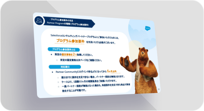 Salesforceコンサルティングパートナープログラムにご参加いただくためには、 プログラム参加要件 を充足いただく必要がございます。 18 プログラム参加要件資格 プログラム参加要件とは ● 所定の認定資格を2つ取得してください。 ○ 所定の認定資格は次ページをご確認ください。 対応期日 ● Partner Communityにログインできるようになってから 6ヶ月以内 ○ 期日までに要件を充足できない場合、パートナー契約は無効となります。 ○ ケースより、1回限り3ヶ月の期限延長をご依頼いただけます。 ○ 一度パートナー契約が無効となった場合も、再度要件を充足できた時点で再有 効化することが可能です。 1 - プログラム参加要件の充足 - Partner Programの理解(プログラム参加要件) 1