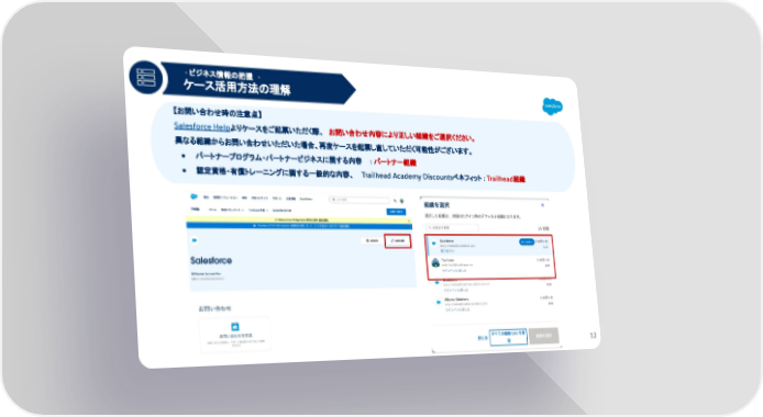 - ビジネス情報の把握 - ケース活用方法の理解 1 12 【お問い合わせ時の注意点】 Salesforce Helpよりケースをご起票いただく際、 お問い合わせ内容により正しい組織をご選択ください。 異なる組織からお問い合わせいただいた場合、再度ケースを起票し直していただく可能性がございます。 ● パートナープログラム・パートナービジネスに関する内容 : パートナー組織 ● 認定資格・有償トレーニングに関する一般的な内容、 Trailhead Academy Discountsベネフィット : Trailhead組織