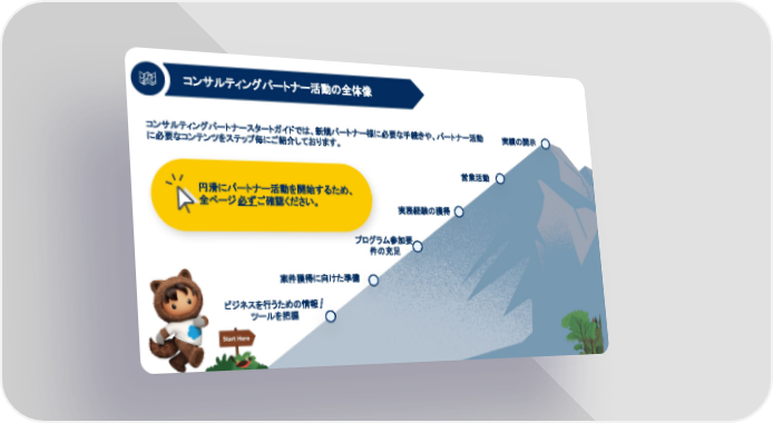ビジネスを行うための情報 / ツールを把握 コンサルティングパートナー活動の全体像 1 案件獲得に向けた準備 プログラム参加要 件の充足 実務経験の獲得 営業活動 実績の開示 コンサルティングパートナースタートガイドでは、新規パートナー様に必要な手続きや、パートナー活動 に必要なコンテンツをステップ毎にご紹介しております。 円滑にパートナー活動を開始するため、 全ページ必ずご確認ください。 2