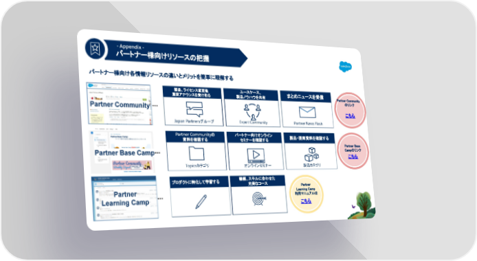 パートナー様向け各情報リソースの違いとメリットを簡単に理解する Partner Community Partner Base Camp Partner Learning Camp ・・・ ・・・ ・・・ 製品、ライセンス変更他 重要アナウンスを受け取る Partner Communityの 資料を確認する プロダクトに特化して学習する ユースケース、 製品ノウハウを共有 パートナー向けオンライン セミナーを確認する まとめニュースを受信 製品・提案資料を確認する 職種、スキルに合わせた 充実なコース Expert Community Japan Partnersグループ Partner News Flash 製品カテゴリ オンラインセミナー Topicsカテゴリ Partner Learning Camp 利用マニュアルは こちら Partner Base Campのリンク こちら Partner Community のリンク こちら 1 - Appendix - パートナー様向けリソースの把握 57