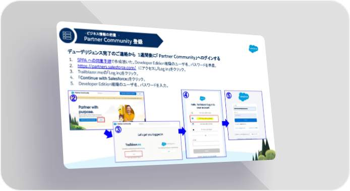 デューデリジェンス完了のご連絡から 1週間後に「 Partner Community」へログインする 1. SPPA への同意手順で作成頂いた、Developer Edition組織のユーザ名、パスワードを準備。 2. https://partners.salesforce.com/ にアクセスし「Log in」をクリック。 3. Trailblazer.meの「Log in」をクリック。 4. 「Continue with Salesforce」をクリック。 5. Developer Edition組織のユーザ名、パスワードを入力。 - ビジネス情報の把握 - Partner Community 登録 1 5 ② ③ ④ ➄