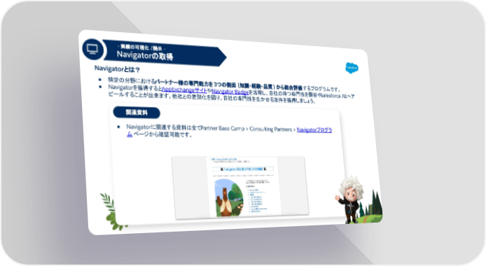 - 実績の可視化 /開示 - Navigatorの取得 1 Navigatorとは? ● 特定の分野におけるパートナー様の専門能力を 3つの側面 (知識・経験・品質) から総合評価するプログラムです。 ● Navigatorを獲得するとAppExchangeサイトやNavigator Badgeを活用し、自社の持つ専門性を顧客やSalesforce AEへア ピールすることが出来ます。他社との差別化を図り、自社の専門性を生かせる案件を獲得しましょう。 ● Navigatorに関連する資料は全てPartner Base Camp > Consulting Partners > Navigatorプログラ ム ページから確認可能です。 関連資料 52